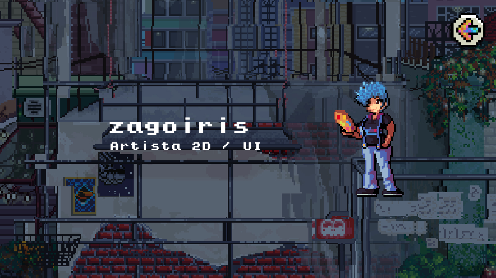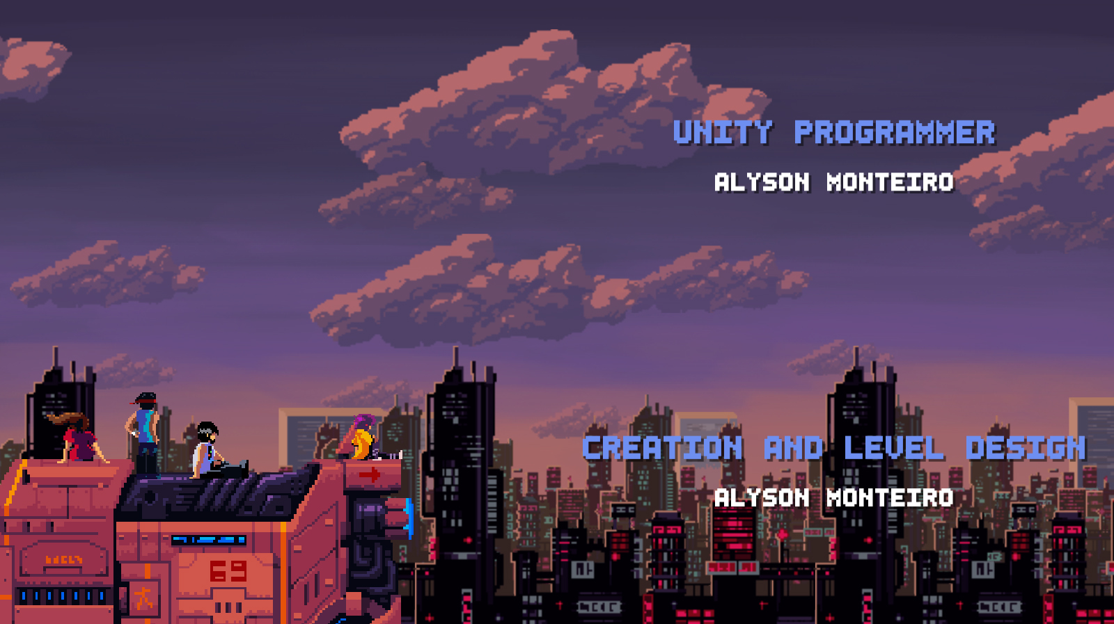 Nossa equipe de desenvolvimento contou comigo como artista 2D de personagens e animações, Zago como artista de cenário e UI, e Erick (CanvasDev) como programador principal. O tema “Efeito Colateral” foi a inspiração para a criação do jogo.