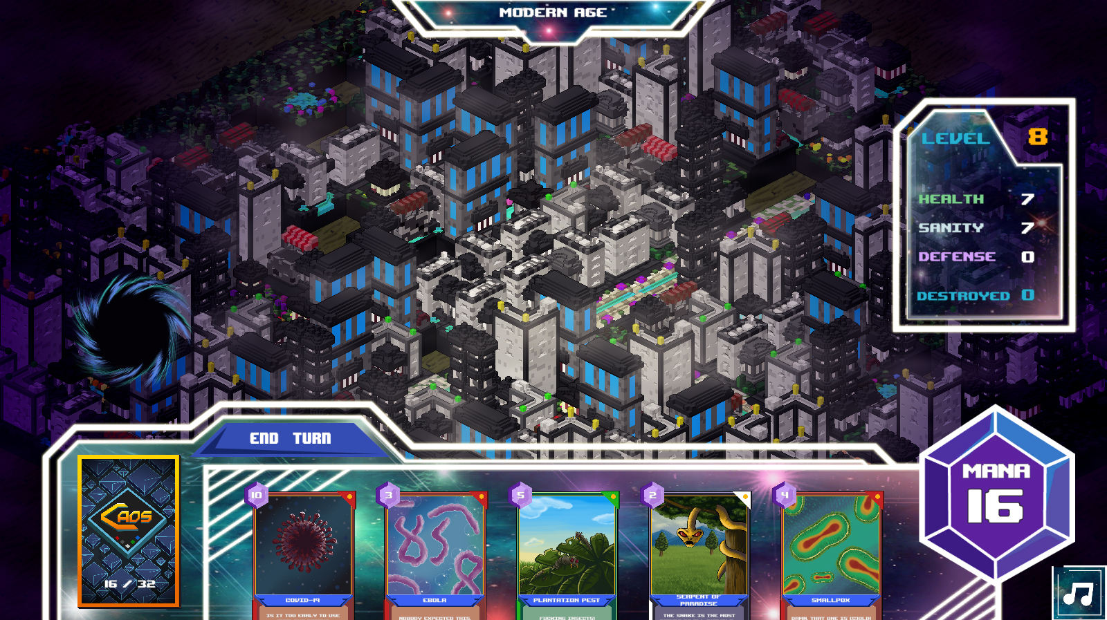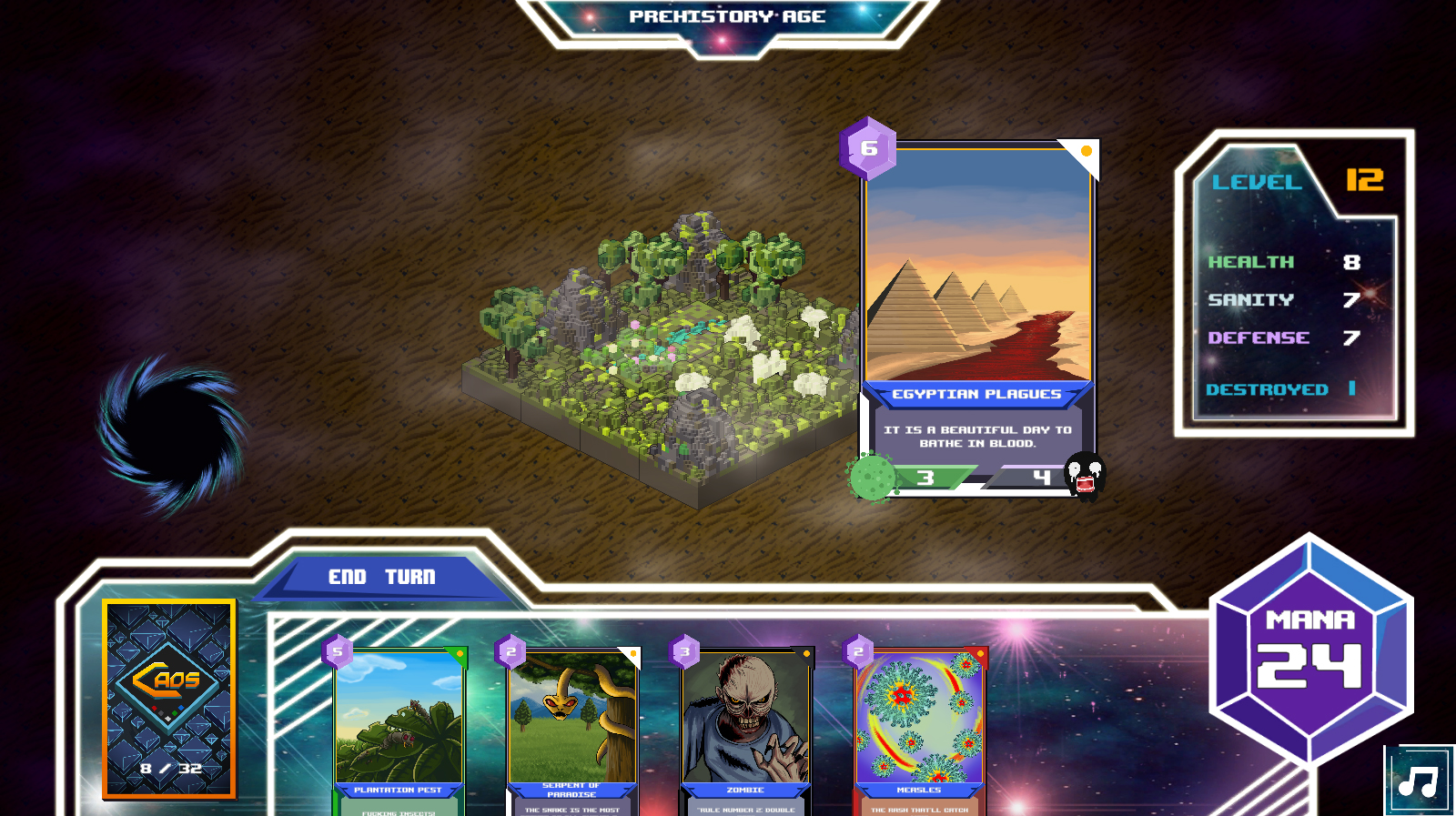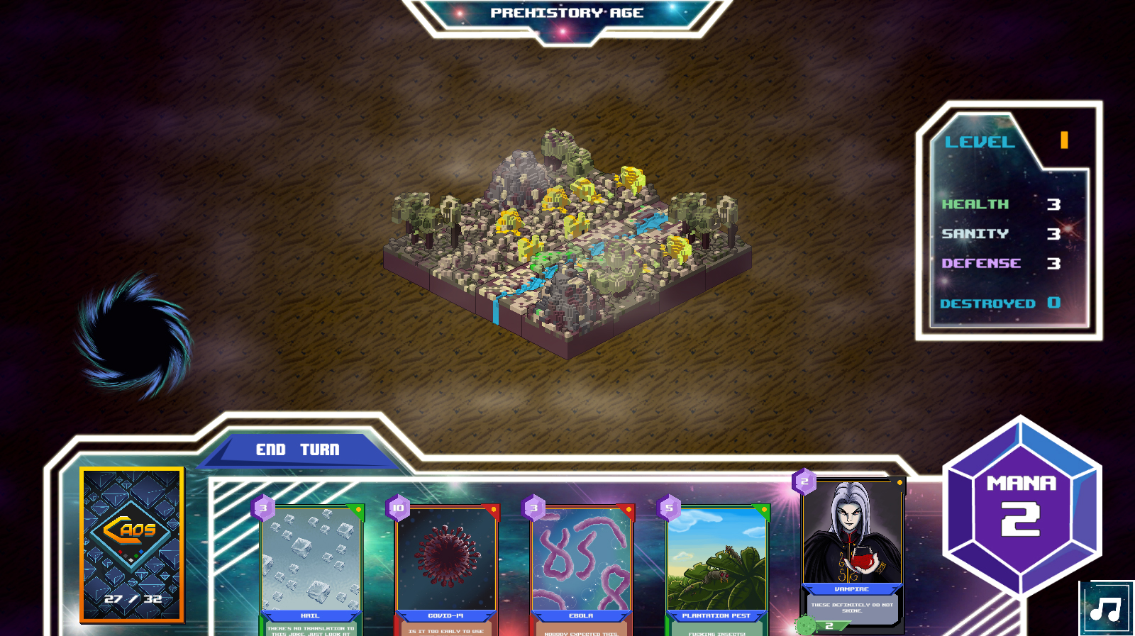 Com gráficos voxel e uma jogabilidade de cartas viciante, CAOS é um game 2D único que cativa os jogadores de todas as idades. Descubra por que este jogo foi o grande vencedor da gamejam da DEVJAM em 2021 e experimente a sensação de ser um Deus da destruição no controle da evolução da humanidade.