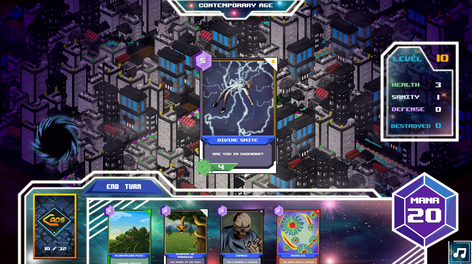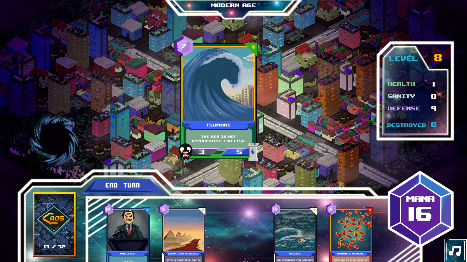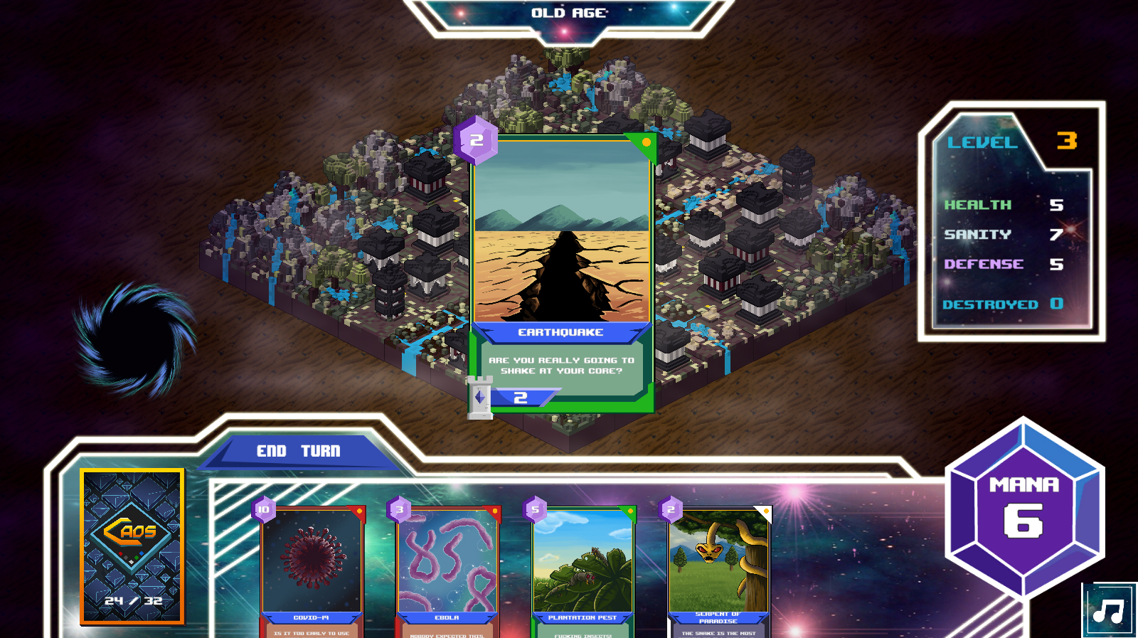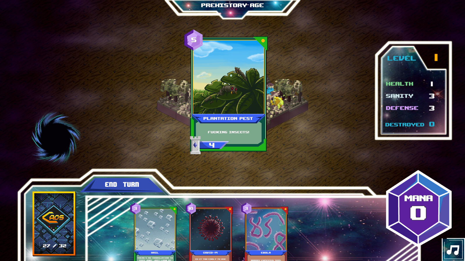 Com gráficos voxel e uma jogabilidade de cartas viciante, CAOS é um game 2D único que cativa os jogadores de todas as idades. Descubra por que este jogo foi o grande vencedor da gamejam da DEVJAM em 2021 e experimente a sensação de ser um Deus da destruição no controle da evolução da humanidade.